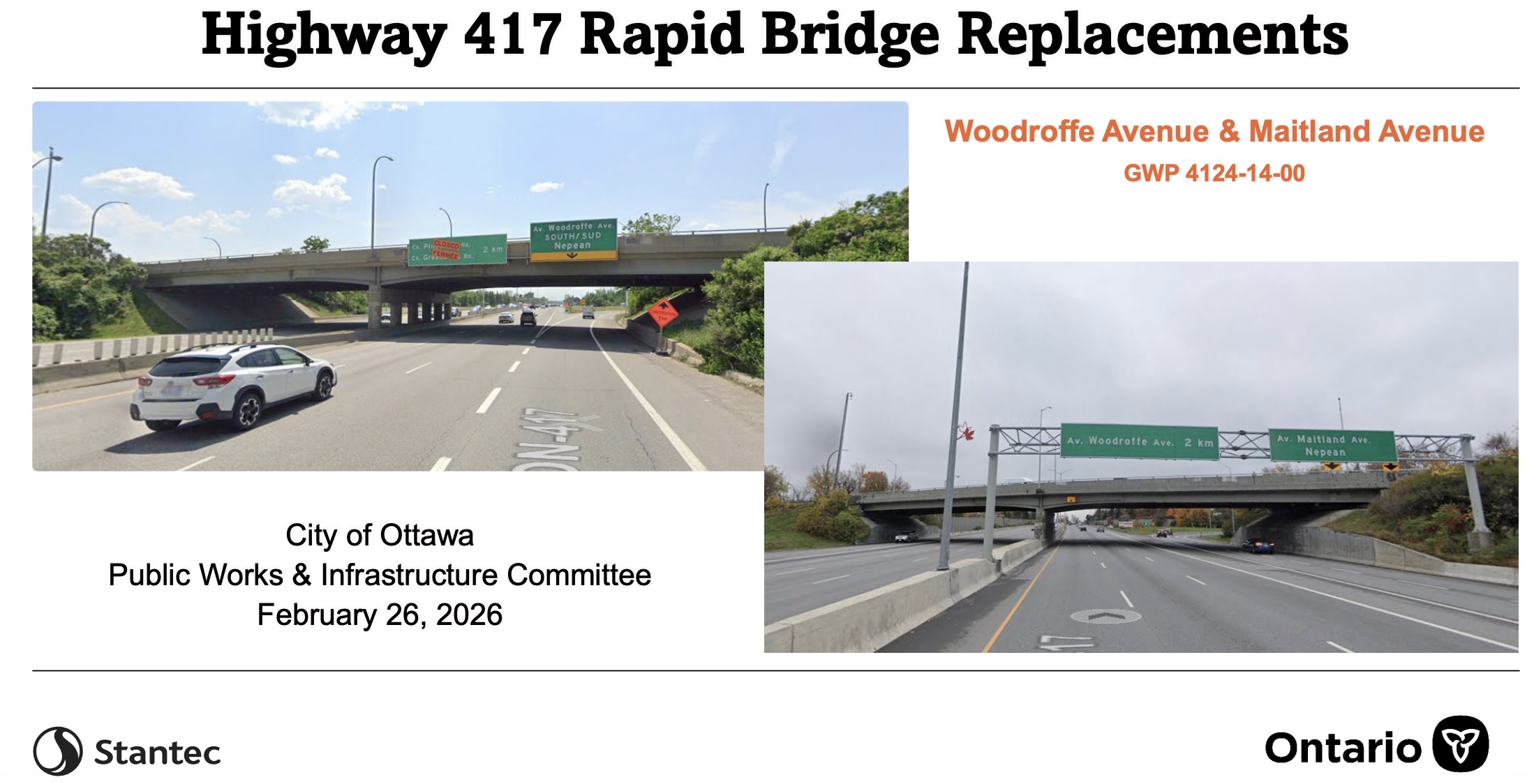 Additionally, the Ontario Ministry of Transportation outlined plans for rapid bridge replacements on Highway 417 at Woodroffe and Maitland avenues.