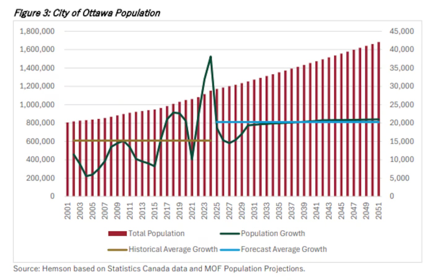 According to the report, Ottawa’s population is projected to increase by approximately 530,000 residents from its 2024 level of 1.15 million. This represents an average growth of 19,600 people per year.