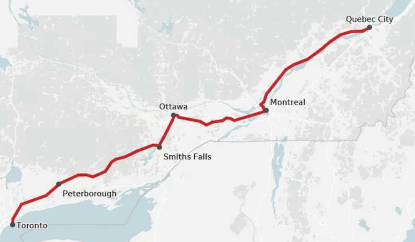 The 1,000-kilometre network will eventually connect seven cities: Quebec City, Trois-Rivières, Montreal, Laval, Ottawa, Peterborough, and Toronto.
