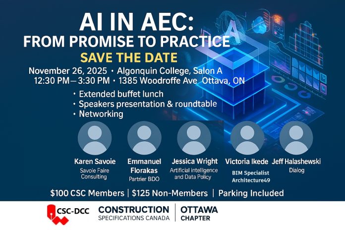 “Artificial intelligence is no longer a futuristic concept; it’s a tool being implemented on job sites and in design studios today,” said a CSC Ottawa Chapter spokesperson. “Our goal is to move past the hype and provide our members and the broader AEC community with tangible insights into how AI is reshaping project management, design, and building specifications.”