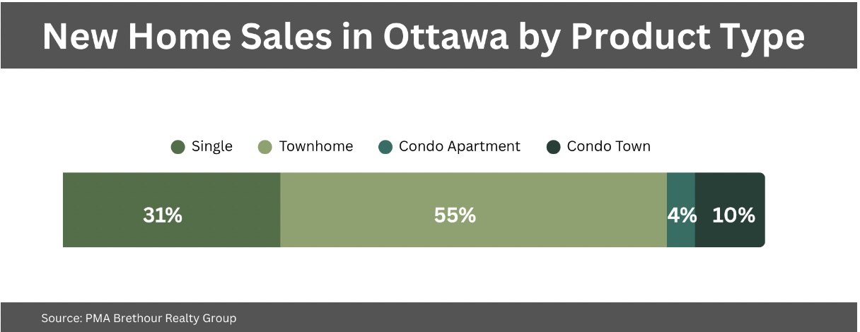 Townhomes were the most popular product type, making up 55 per cent of all sales. Single-detached homes accounted for 31 per cent of sales, while condo towns (10 per cent) and condo apartments (4 per cent) made up the remainder. The report notes this data shows the “sustained strength of the family-oriented townhouse”.